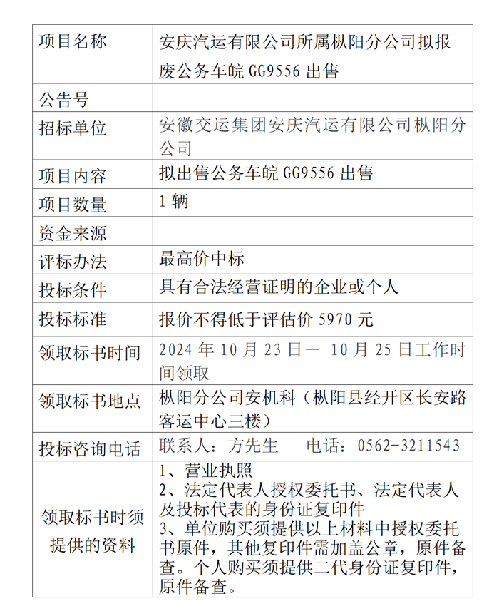 樅陽(yáng)分公司擬報廢公務(wù)車(chē)皖GG9556出售公告
